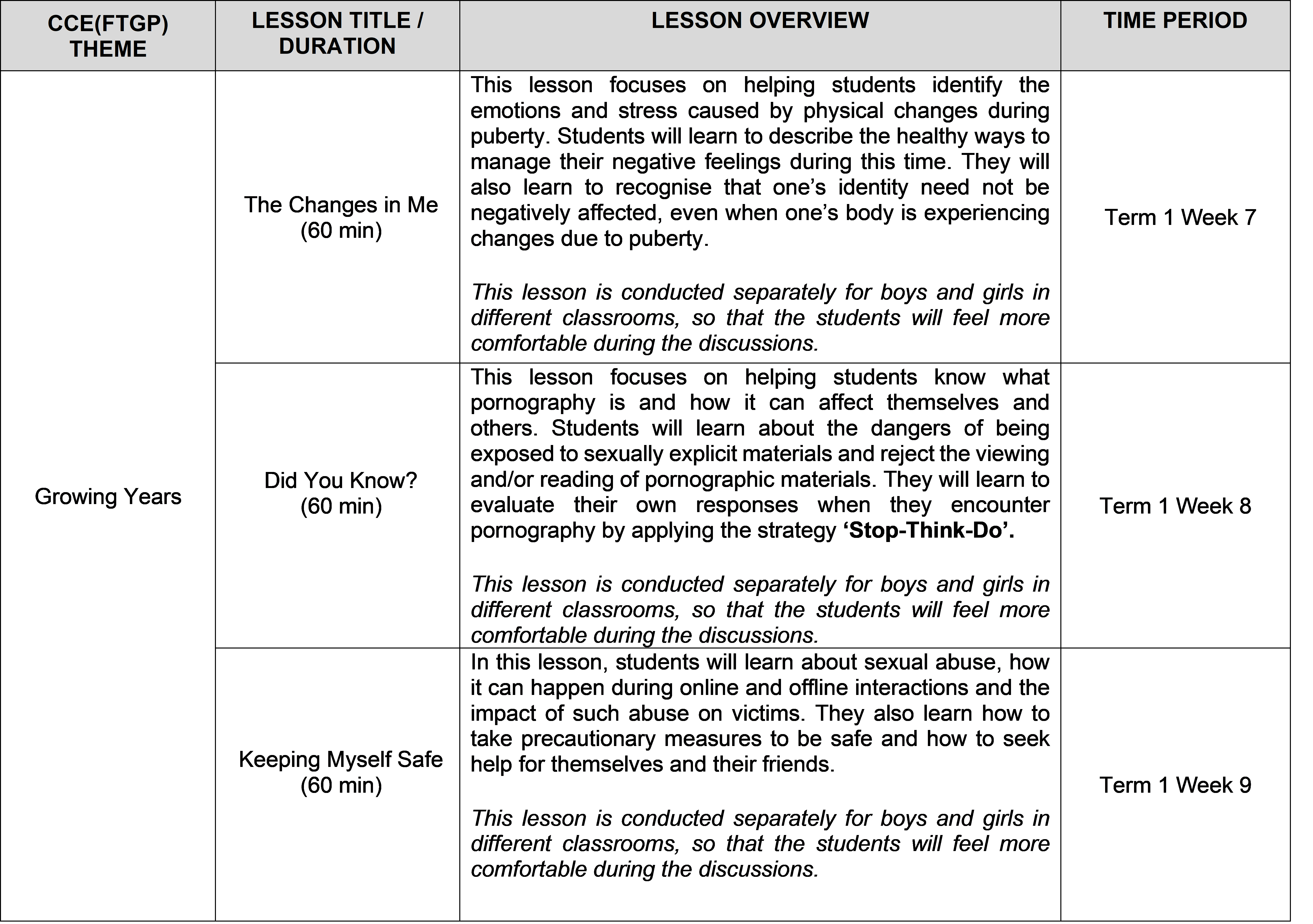 Sexuality Education (SEd) lessons are taught as part of CCE (FTGP) at Primary 5 and 6. Through these lessons, students will learn healthy ways to manage the physiological, social and emotional changes in their growing years. They learn to build healthy and rewarding relationships with others, including those with members of the opposite sex. Students are also guided to make wise, informed and responsible decisions to keep themselves safe from sexuality-related risks.