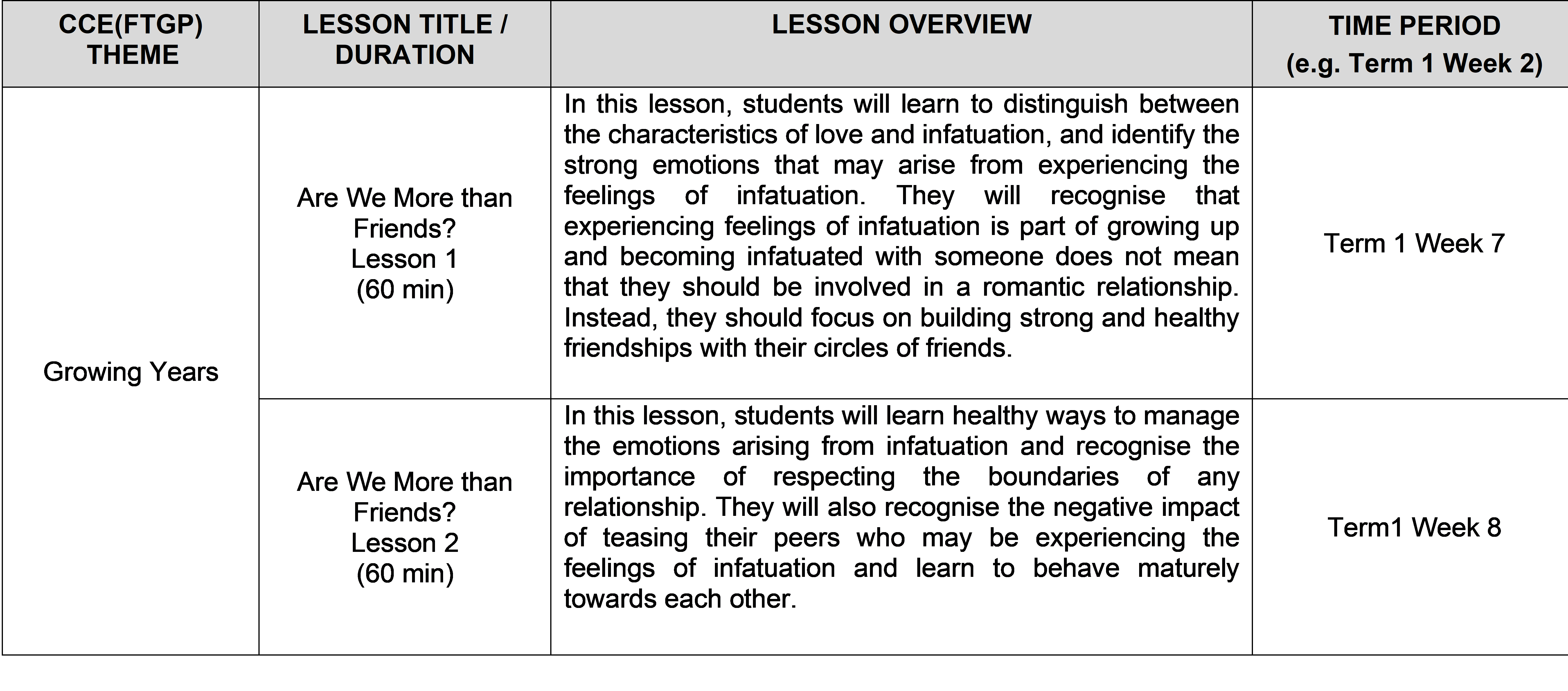 The upper primary years mark the onset of puberty. With better nutrition and improved health care, children are reaching puberty at a younger age and have to grapple with physical, emotional and psychological changes in themselves. The implication is that our children are becoming biologically ready for sexual activity sooner without necessarily having the corresponding cognitive or emotional maturity to modulate their behaviours. Furthermore, our young are also exposed to a wide range of influences that could endanger health and undermine the integrity of the family. Our students require close guidance so that they can respond with discernment to the sexual messages in the media and other sources.